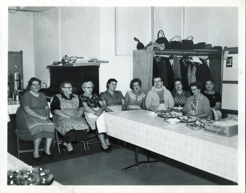 “Church Basement Ladies,” January 10, 1965, H.J. Elmer’s 50th Wedding Anniversary. Names from the back of the photo. Left to right: Mrs. Updike, Clara Elmer, Lena Babler, Lena Spring, Barb Roethlisberger, Bernice Meier, Aunt Alfa, Gertude Zeller, and Emma Babler. For more, go to www.monticellohistoricalsociety.org.