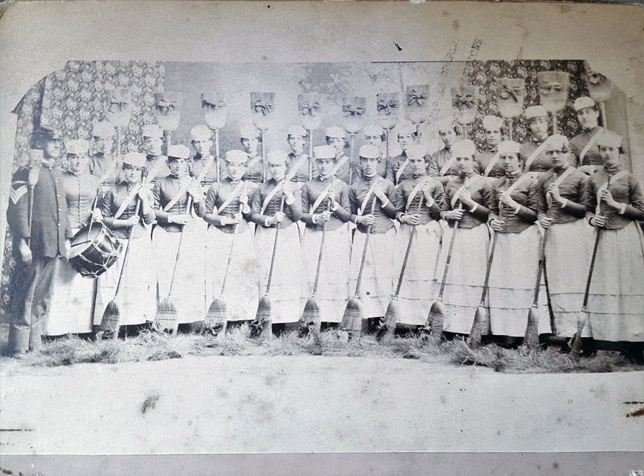 This broom brigade participated at public functions smartly dressed in red and white uniforms to present their formations. It was said that they would be “worth the price of admission alone, to see those handsome girls wield the broom.” Broom Brigade dustpans became all the rage for parlor ornaments.