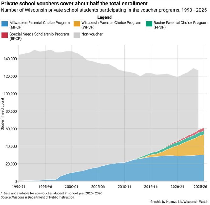 Flash forward to last school year: Nearly half (46%) of all private school students in Wisconsin received vouchers across the state’s four programs. Taxpayers this school year will spend more than $700 million to defray tuition costs for about 60,000 students. Almost all (about 96%) attend religiously affiliated schools.