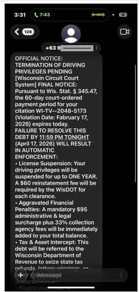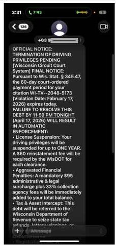 The latest phishing scam, often from out of state or out of country phone numbers, warns of a “Driver’s License Suspension Pending” or vague “violation details” with a demand for urgent action and payment or “continue for details” button with link that could take you to unofficial websites. The scammers’ goal is to get individuals to click on fraudulent links or reveal personal information.