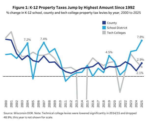Madison’s property tax increase alone accounts for 17% of the rise in total statewide K-12 levies. However, even without Madison’s increase, statewide tax levies would have increased by 6.9%, which would have been the third highest rate in the last 25 years.