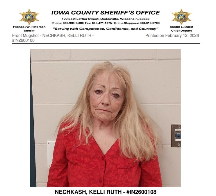 Kelli Nechkash was arrested on a state Department of Corrections Parole Supervision hold after a crash on Sunny Ridge Road near Spring Road in the Town of Waldwick Feb. 11 around 11:10 p.m. Todd Nechkash’s prescription medication and phone were found inside Kelli Nechkash’s car, according to WMTV, along with a large kitchen knife and blood-stained clothing. Kelli Nechkash was booked on sixth-offense drunk driving, possession of an illegally obtained prescription, and possession of a controlled substance, according to an Iowa County Circuit Court news release. She was also ticketed with failure to keep a vehicle under control. During a search warrant in the Iowa County Jail, WMTV reported, Kelli Nechkash said “I didn’t mean to murder him,” “I did not want to kill him” and “I did not mean to do that.”
