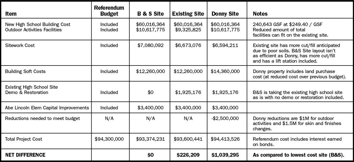 The two cheapest options had been the current site, which is just 40-acres, with $3.9 million needed for earthwork and utilities, and the 70-acre Donny property on County DR (approximately $6.2 million total cost for land, earthwork and utilities). The 70-acre B&S property, adjacent to 31st Avenue on Monroe’s far east side, was originally going to cost about $1.2 million for the land and a total cost of about $6.7 million.