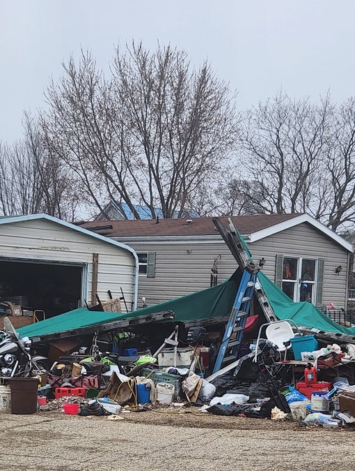 The Browntown trailer home of Randy Boeck, Brittany Boeck and Chad Olson has a fallen building structure and rubbish strewn about the property. All three were arrested on March 4 and face charges of child neglect.