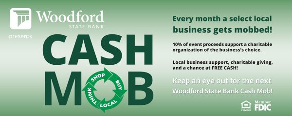 Each month, Woodford State Bank chooses a local business to mob and that business gets to pick their favorite organization to donate a portion of the proceeds for the day. There is a “cash drop” designated at a certain time where money is given away to either spend at the business or donate to the organization. These “cash mobs” are promoted on social media. This supports the business, the organization, and the local community.
