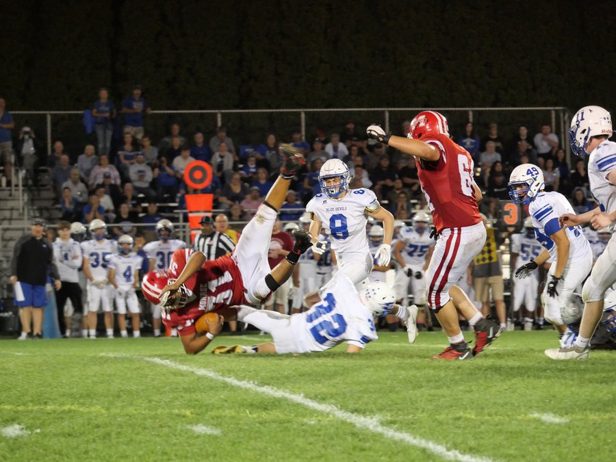 Brushed back but not knocked out, the Blue Devils responded with haste. Just four snaps later, quarterback Chase Maves chucked a ball deep into Monroe’s secondary, where top wideout Trevor Bahrs was there for a catch-and-run 44-yard TD. A missed extra point kept Monroe in the lead at 7-6.