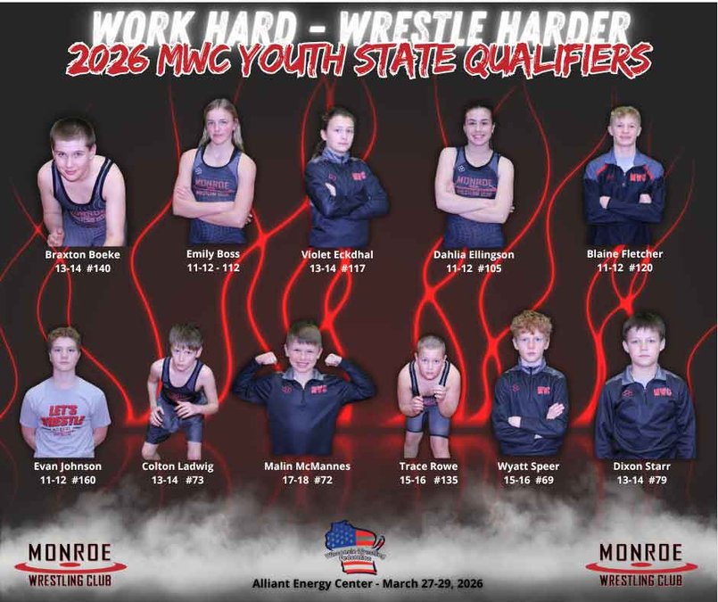 Seventeen Monroe Wrestling Club wrestlers competed at the Qualifiers recently. Eleven are moving on to the youth state tournament March 27-29 at the Alliant Energy Center.